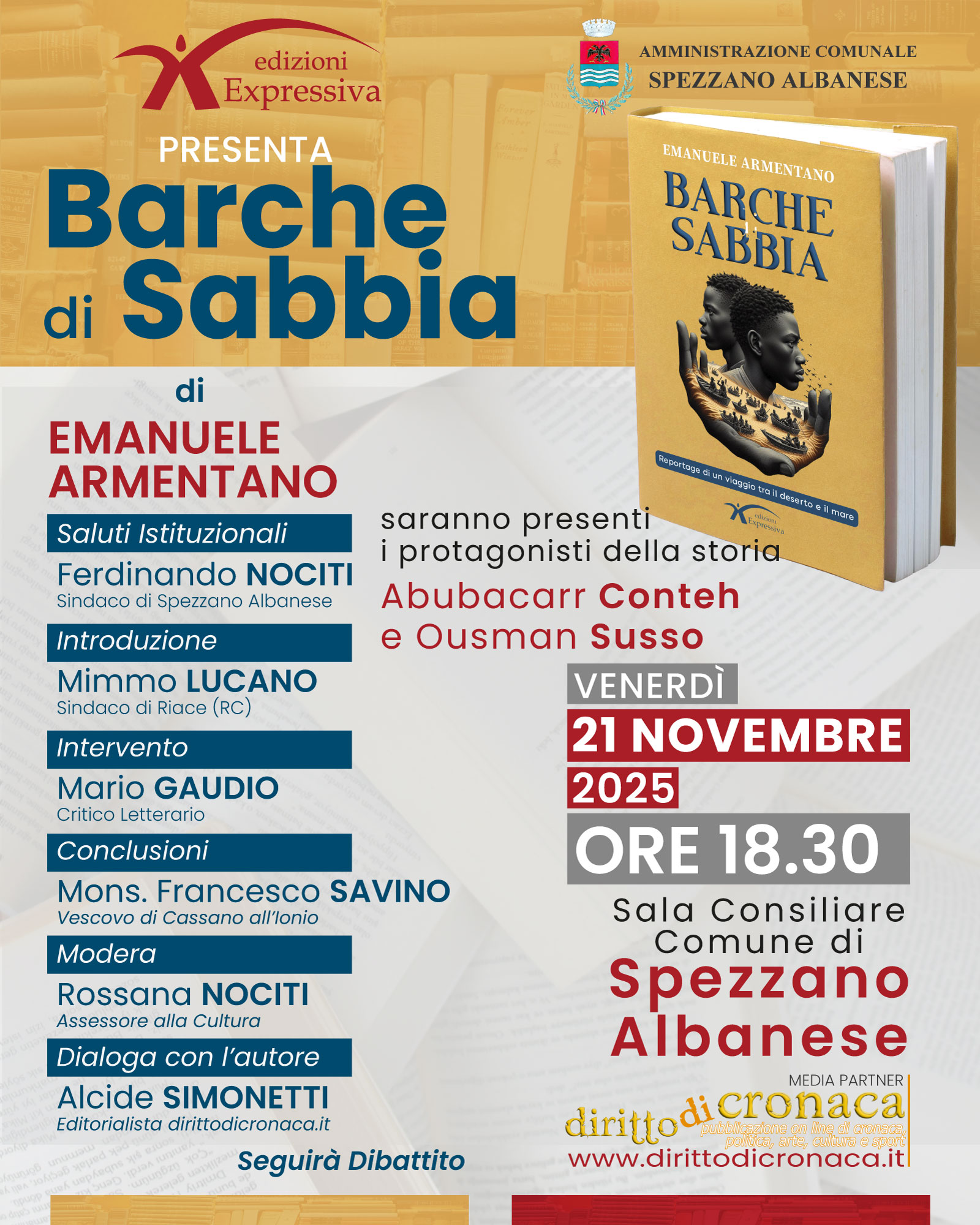 SPEZZANO ALBANESE - La comunità di Spezzano Albanese si prepara ad accogliere la presentazione del libro “Barche di Sabbia - Reportage di un viaggio tra il deserto e il mare” di Emanuele Armentano, il prossimo venerdì 21 novembre alle ore 18:30, nella sala consiliare del municipio. L'evento letterario, realizzato in collaborazione con la testata giornalistica dirittodicronaca.it, oltre ai protagonisti dell'opera Abubacarr Conteh e Ousman Susso, vedrà la partecipazione di due figure di rilievo: Mimmo Lucano e mons. Francesco Savino, che hanno firmato rispettivamente la presentazione e la prefazione del volume.